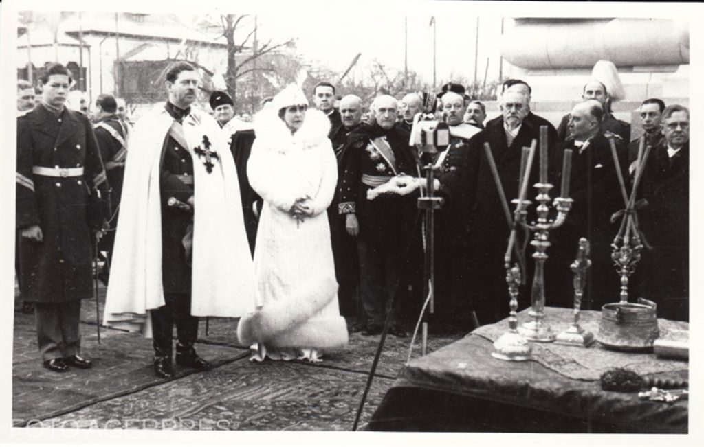 Inaugurarea Arcului de Triumf din 1936. În partea stângă, de la stânga la dreapta, asistă Marele Voievod de Alba Iulia, Mihai, regele Carol II și regina Maria