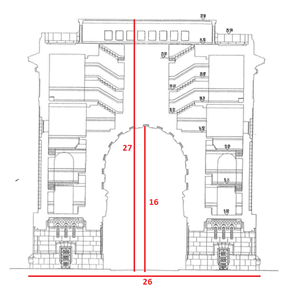 Dimensiunile construcției sunt: 27 de metri înălțime, 26 de metri lățime și 16 metri înălțimea arcadei interioare.