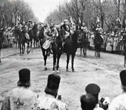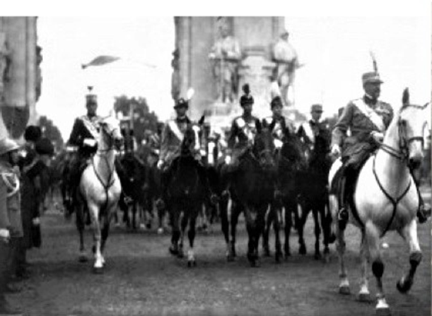 Suveranii României reîntregite în fața Arcului de Triumf (provizoriu) în 1918