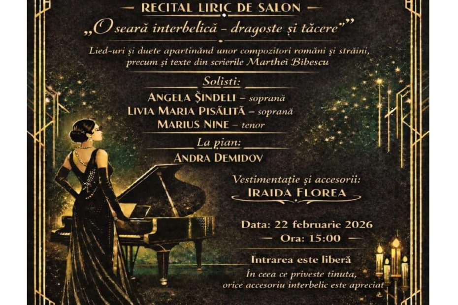 Centrul de Cultură „Palatele Brâncovenești de la Porțile Bucureștiului” invită publicul duminică, 22 februarie 2026, de la ora 15:00, în eleganta Sală a Scoarțelor, la un recital de excepție dedicat împlinirii a 140 de ani de la nașterea prințesei Martha Bibescu (28 ianuarie 1886), una dintre cele mai fascinante și emblematice personalități feminine ale culturii române și europene. Intitulat „Recital liric de salon”, evenimentul propune o reconstituire artistică a atmosferei rafinate a saloanelor aristocratice de altădată, îmbinând muzica vocală, literatura și arta costumului într-un demers cultural de mare finețe.… Citește mai mult »Comunicat Recital liric de salon