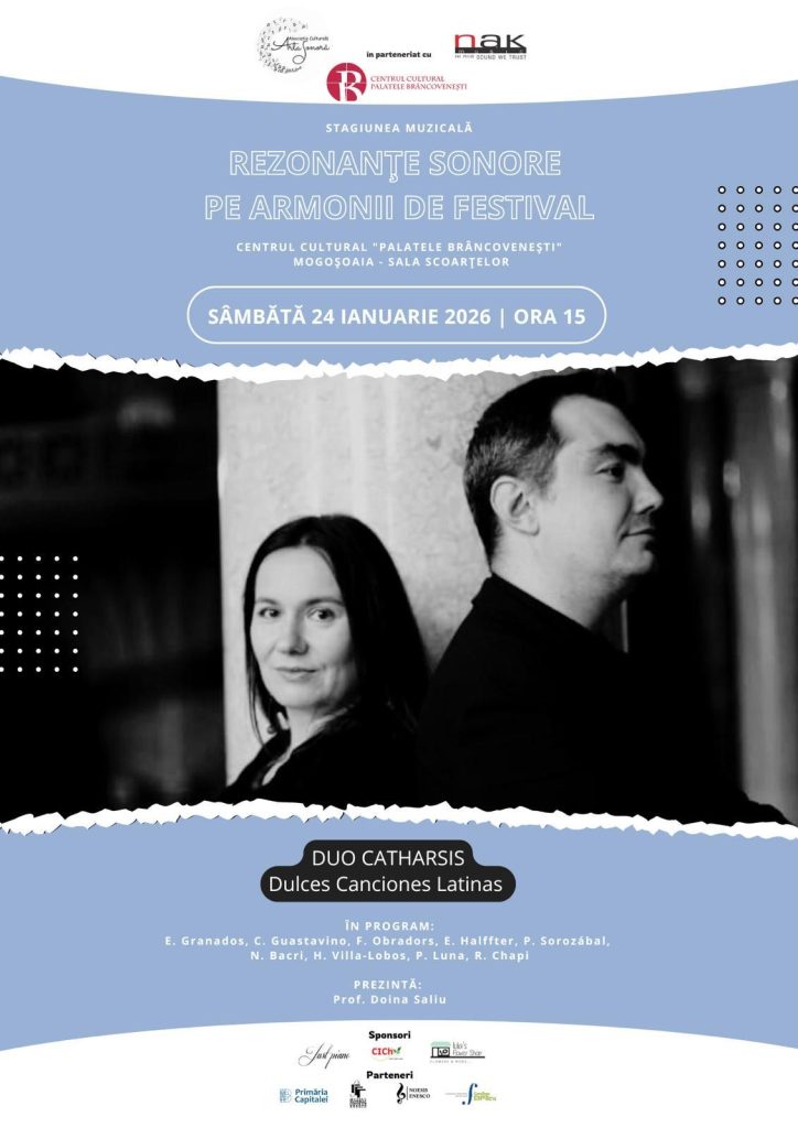 Centrul de Cultură „Palatele Brâncoveneşti de la Porţile Bucureştiului” și Asociația Culturală „Arta Sonoră” vă invită să participați sâmbătă, 24 ianuarie 2026, începând cu ora 15:00 la recitalul susținut de Duo Catharsis – Dulces Canciones Latinas.