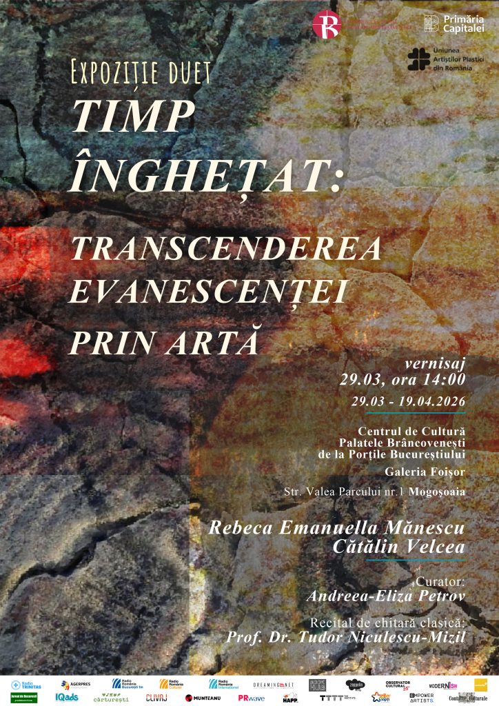 Primăria Municipiului București, prin Centrul de Cultură „Palatele Brâncovenești de la Porțile Bucureștiului”, găzduiește, la Galeria Foișor, în perioada 29 martie – 19 aprilie 2026, expoziția de grafică și fotografie contemporană „Timp înghețat: transcenderea evanescenței prin artă”, semnată de artiștii Rebeca Emanuella Mănescu și Cătălin Velcea, sub curatoriatul Andreei-Eliza Petrov.